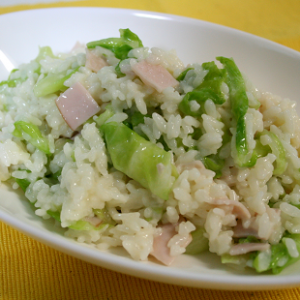 2.フライパンにバターを中火で溶かし、キャベツを1分ほど炒める。ご飯、ハム、チキンコンソメ、酒、水を入れて全体をざっくり混ぜて2分ほど煮る。粉チーズと塩を入れて1分ほど煮て出来上がり。