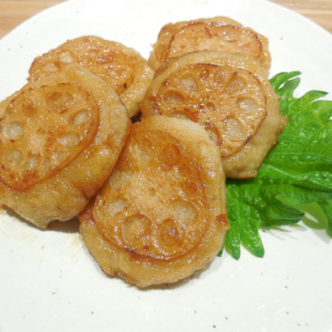 6等分にし丸く成形し、片面に薄切りにしたれんこんを貼り付ける。