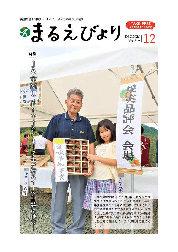 今月の表紙は、第38回なかやま栗まつり栗果実品評会で県知事賞に輝いた栗の生産者です。特集では現在、えひめ中央ひなたCAFEと進行している松山大学の学生とのプロジェクトをご紹介しています。旬を迎えるキウイフルーツを使った、学生考案のスイーツがいよいよ商品化されます。ぜひご覧ください♪