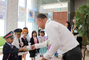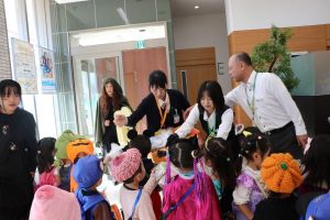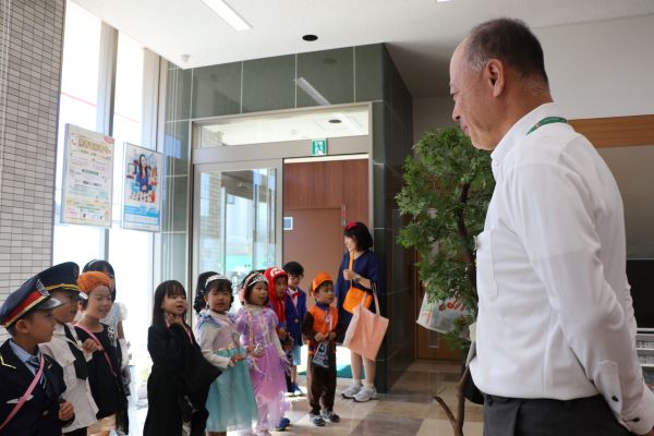 生石支所に10月29日、生石保育園から可愛いお化けがやってきました! かぼちゃのお化けや魔女、人気アニメのキャラクターなどに仮装した園児たち57人は、3組に分かれて順番に支所の窓口へ訪れました。 お化けご一行様ご来店! 声を揃えて「トリックオアトリート、お菓子をくれないと、いたずらしちゃうぞ」 上手に言えました! 笑顔でお菓子を受け取ってくれました♪ 同支所の一色哲一支所長は「地域の一員として、今後も地域の子どもたちを守り育むお手伝いをしていきたい」と話しました。 < 前のページへ 一覧を見る