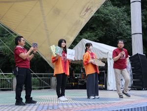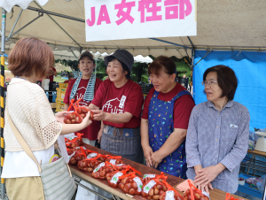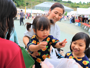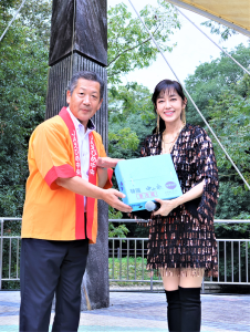 会場には地元企業や団体等から23の出店があり、県内外から約10,000人が来場。同JAが行った栗のつかみどりや果実オークション、JA女性部の手作り栗おこわ・栗寿司販売にも長蛇の列ができました。武市佳久理事長が、歌唱で会場を盛り上げたゲスト歌手の早見優さんへ「生産者が丹精込めて育てた歴史ある中山栗をどうぞ」と栗3㌔箱と、紅まどんなジュースを贈呈。