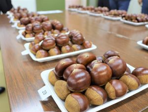 品評会には管内の生産者29人が丹精して栽培した「中山栗」の特選栗「銀寄」や「紫峰」「筑波」「大峰」「利平」の5品種50点が出品されました。